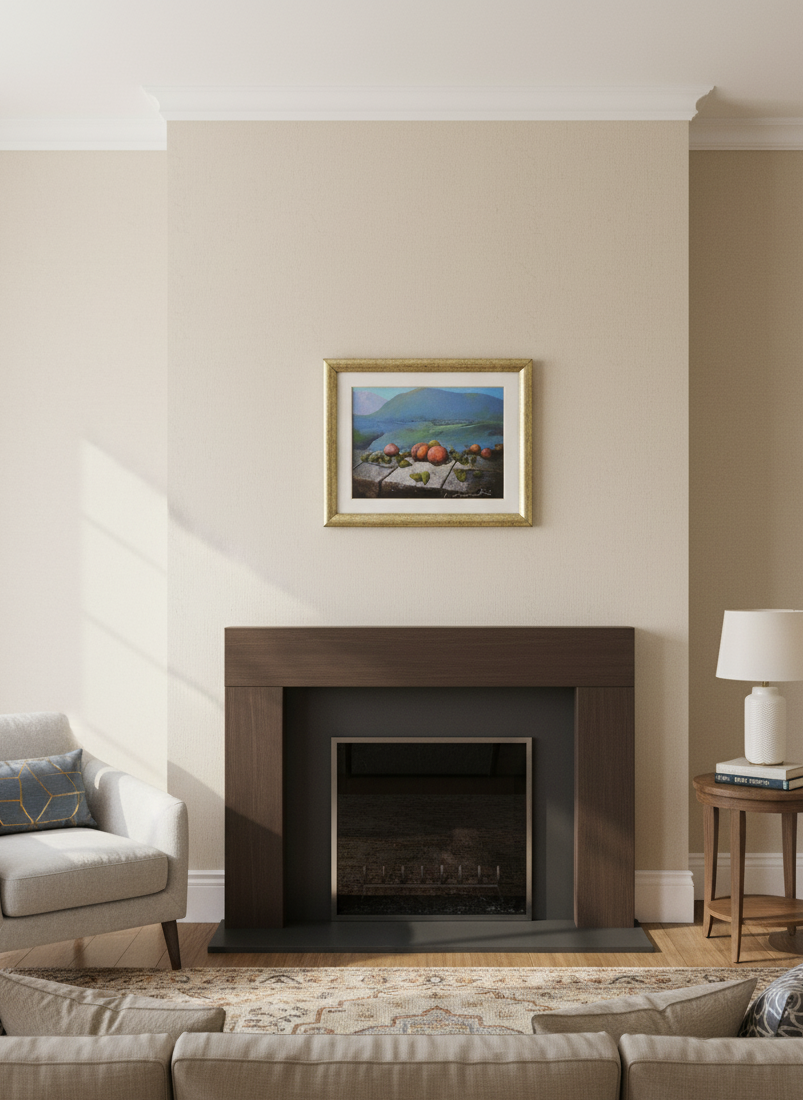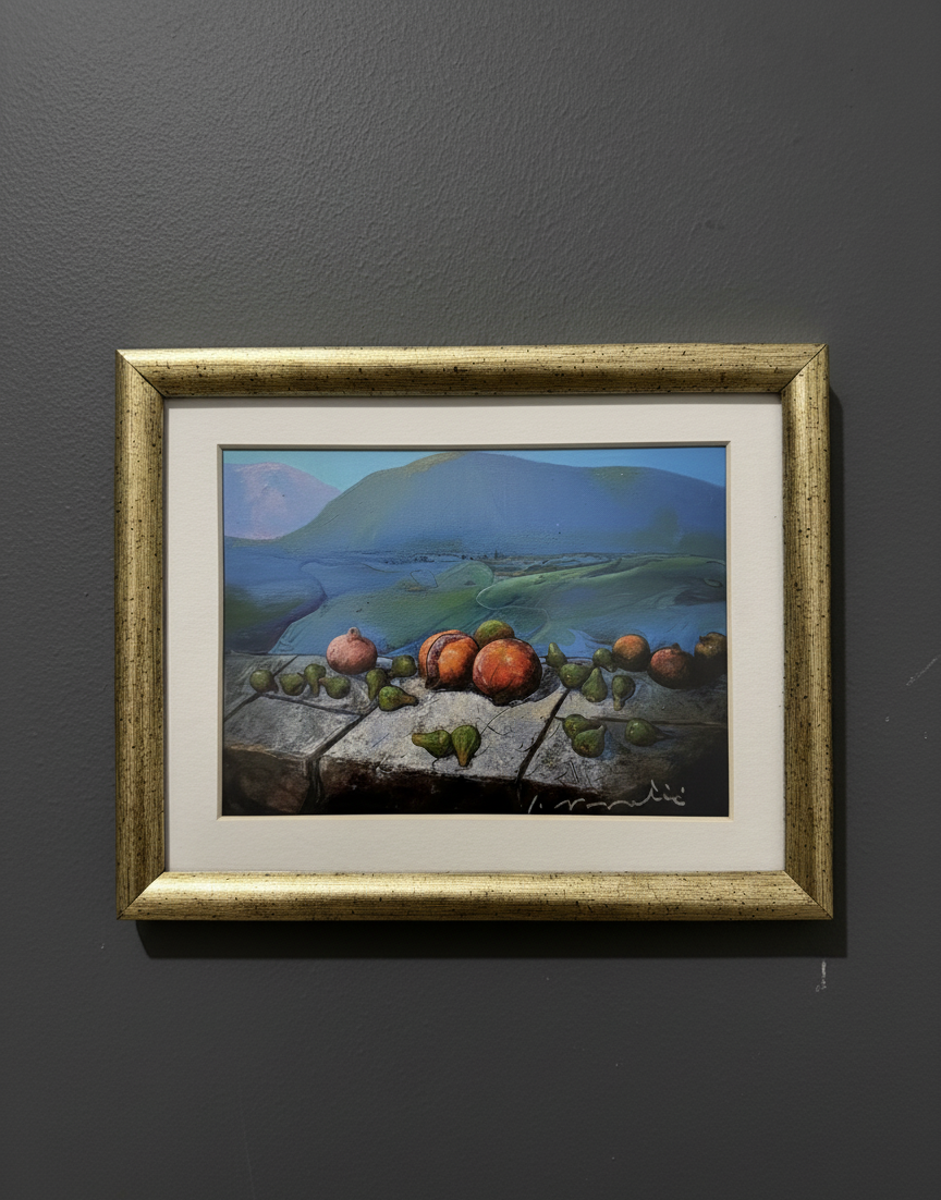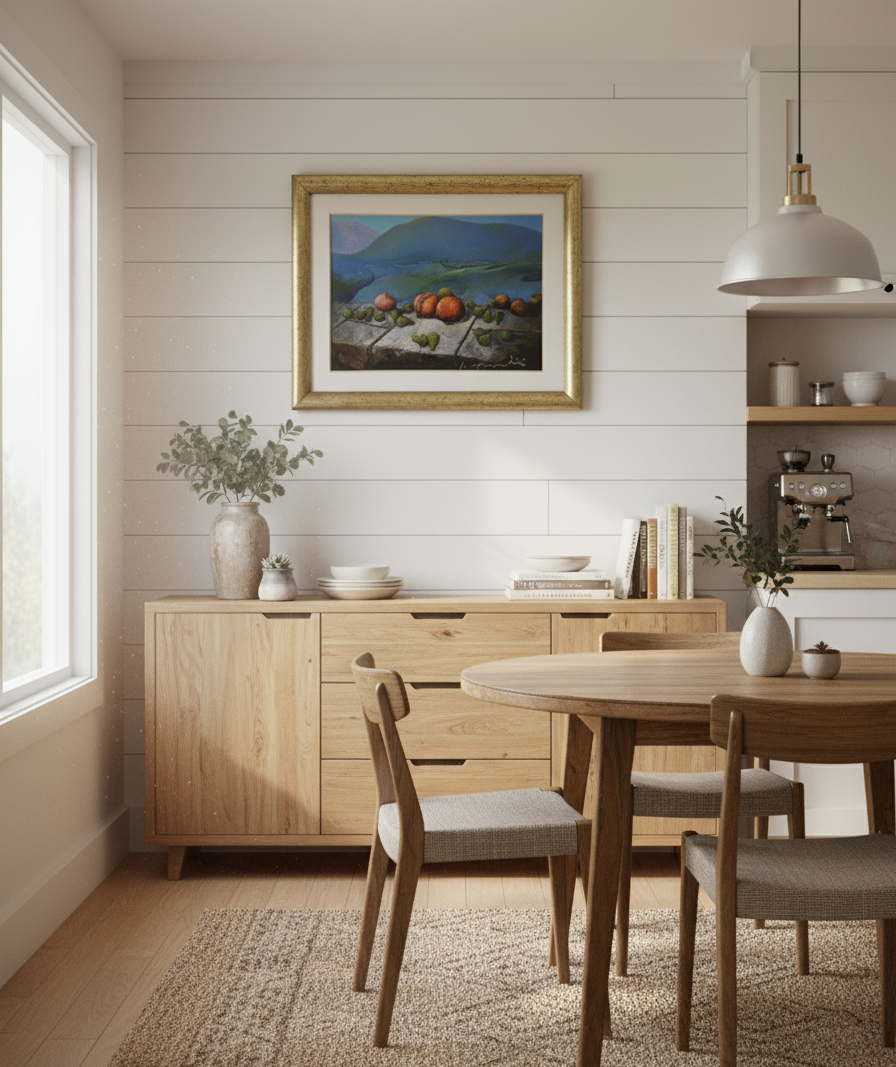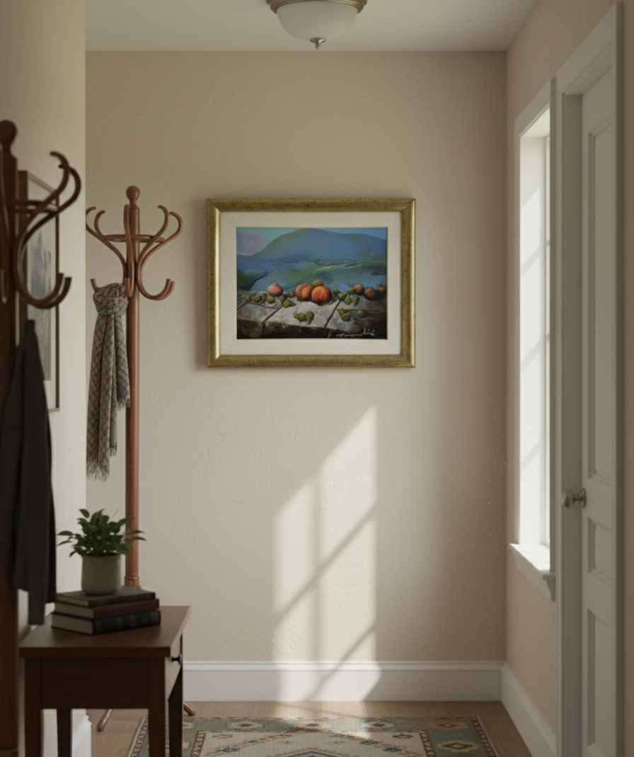 Breng leven, rust en warmte in je interieur met dit unieke kunstwerk dat de schoonheid van het landschap combineert met de levendige kleuren van fruit.